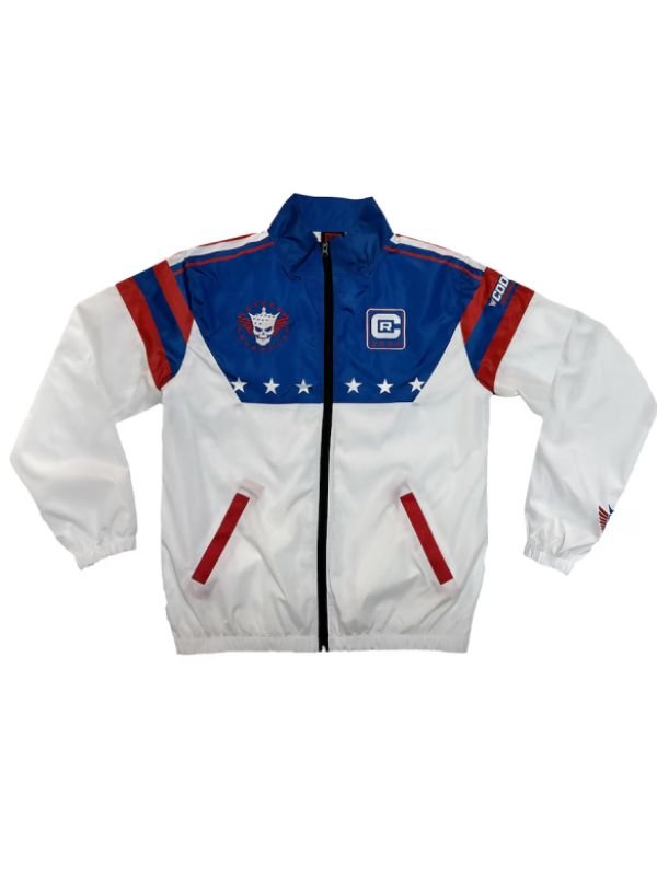 Made of light weight cotton polyester, the windbreaker will offer long-range durability, is form-fitting, and the long sleeve fit allows for comfort the entire day, whatever activities you’re partaking in. The jacket is primarily white with star and striped accents that enhance the overall look and design of the jacket. With its stand up collar, the Cody Rhodes Stars and Stripes Windbreaker jacket presents a sporty look while helping shield you from the cool breeze. The zipper closure allows for easy wear, whether you’re layering before your casual outing, gym session, or to take in a live event.