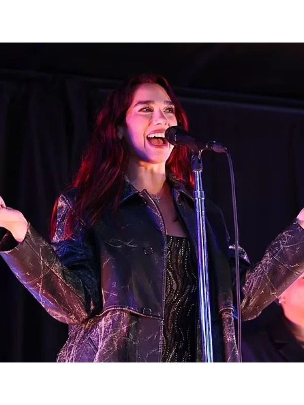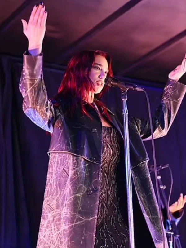 Dua Lipa Distressed Black Leather Coat