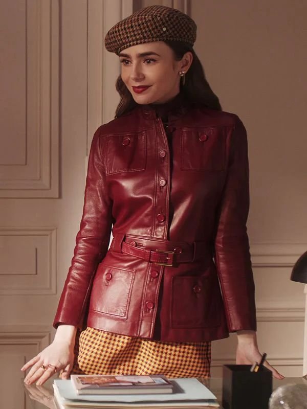 A luxurious addition to your wardrobe, the Emily In Paris S04 Lily Collins Leather Jacket will perfectly complement your stylish look. Lily Collins, the American actress, donned this sophisticated maroon leather jacket while playing Emily Cooper in the 2020 drama series Emily in Paris, flawlessly capturing her character’s chic and stylish essence. This maroon jacket is made of high-quality leather, either genuine or imitation, and exudes style and sophistication. It is comfortable and fits well thanks to the viscose lining inside, making it suitable for long-lasting use. The distinctive buttons and belt fastening give the jacket a modern look that is timeless. Its crisp and structured look is accentuated by the erect collar, while the long sleeves with buttoned cuffs add a sophisticated touch. This versatile jacket that will accentuate your look is ideal for both formal and informal occasions. Designed to mimic the Parisian style of Emily In Paris S04 Lily Collins Leather Jacket, this jacket is a must-have for fashionistas. With this bright jacket, you can easily enhance your style with its elegant design. The Emily Cooper Emily in Paris S04 Maroon Leather Jacket is a perfect representation of Parisian elegance. If you’re looking to embrace iconic fashion, the Emily in Paris Emily Cooper Maroon Leather Jacket is your go-to option for a stylish and refined appearance.