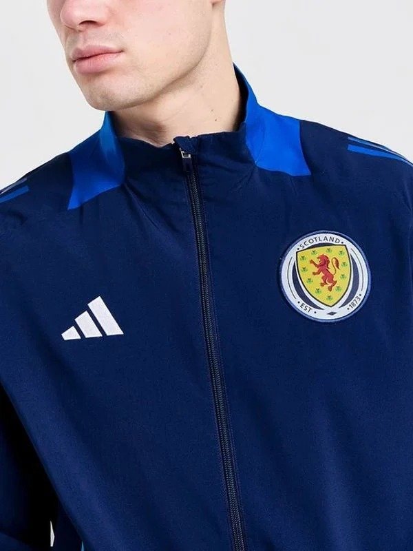 The Euro 2024 Scotland Track Jacket, made for maximum comfort and to show team spirit, is the ideal combination of fashion and utility. Lightweight and durable thanks to its high-quality polyester construction, this jacket is perfect for both casual and active wear. The snug feel provided by the soft inner lining will keep you comfortable all day long. The solid zip fastening and the elegant stand up collar give the jacket a contemporary look and protect it from cold breezes. When you move, the sleeves will stay in place thanks to the snug fit provided by the elastic cuffs. Its eye-catching blue hue, accentuated by the Scottish team insignia, makes it an essential garment for fans. The Adidas Scotland Tiro 24 Presentation Blue Track Jacket is another example of a stylish and functional design, emphasizing team pride and quality. An essential for any wardrobe, the Euro 2024 Scotland Track Jacket combines modern style with national pride for both errands and cheering at the stadium. The adidas Scotland Tiro 24 Presentation Jacket brings a sleek and sporty touch, perfect for showcasing support during the championship.