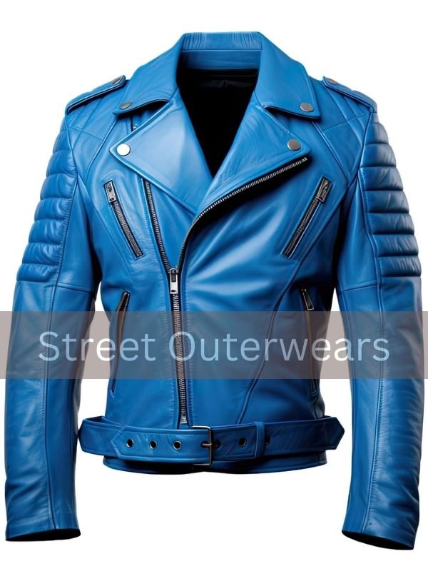 Men’s Royal Blue Genuine Sheepskin Notch Lapel Collar Biker Rider Outfit Asymmetric Crossover Slim Fit Leather Jacket