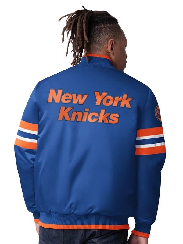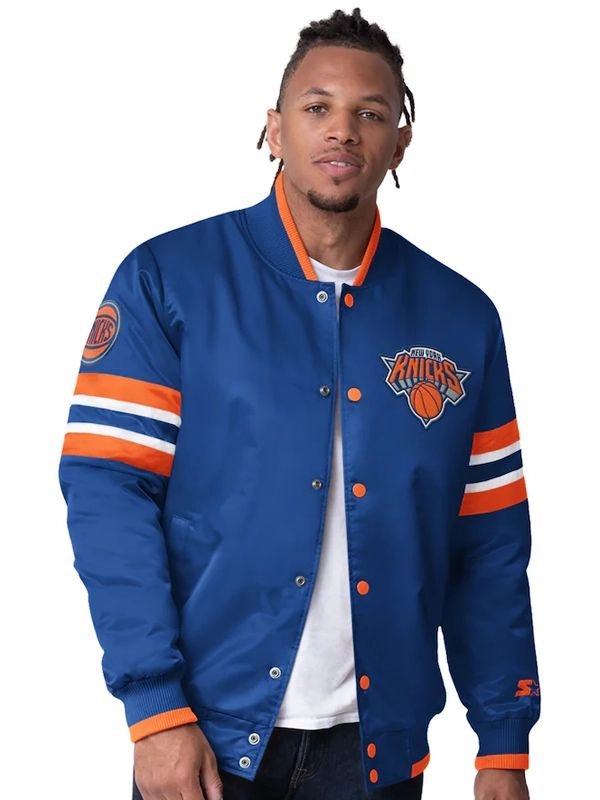 The New York Knicks Starter Blue Scout Varsity Jacket is a must-have for streetwear enthusiasts and sports fans alike. Enter the legendary world of sports fashion. This jacket made of high-quality satin features an ideal blend of team spirit and casual fashion. The striking blue colour exudes vitality and embodies the essence of the Knicks, and the traditional rib-knit collar reminds us of the university era. With long sleeves and a plush inner lining, this jacket is both stylish and cosy, keeping you warm all year round. Wearing it for casual travelling, game days, or a stroll in the city is made easy by the button fastening at the front, which guarantees a tight and secure fit. This jacket, emblazoned with the recognisable Knicks crest, is a true example of club loyalty. This varsity item brings classic athleticism to any outfit, whether you’re on or off the court. Upgrade your collection with this beloved necessity. Fans looking for a versatile option will also appreciate the Men’s New York Knicks Starter Blue Reversible Satin Full-Snap Varsity Jacket, which enhances style with a reversible feature. Alternatively, try the New York Knicks Starter Reversible Satin Full-Snap Varsity Jacket for added flexibility. The New York Knicks Starter Blue Scout Varsity Jacket is more than apparel—it’s a bold fashion statement rooted in legacy.