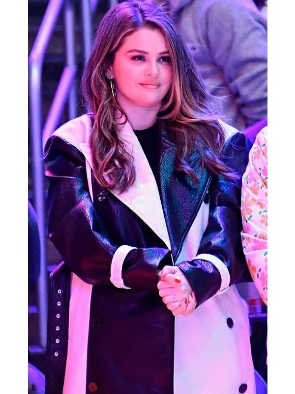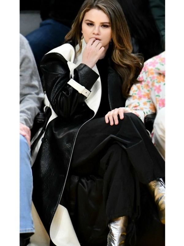 With Selena Gomez’s stunning colourblock leather coat, you can embrace your inner style icon. It is a timeless piece that cleverly combines traditional charm with contemporary flair. Crafted from genuine leather, this Selena Gomez Colorblock Leather Coat features a striking black and white colourblock pattern that is both sophisticated and bold. An elegant belt fastening that cinches at the waist for a defined look accentuates its attractive silhouette. Comfort is guaranteed with every wear thanks to the soft viscose lining, making it suitable for both relaxed gatherings and chic evenings. The mid-length cut and long sleeves are complemented by an elegant collar with lapels, giving the ensemble a refined look. This Selena Gomez Colorblock Leather Coat can make any ensemble look better, whether worn with boots or heels. For anyone who wants to turn heads with ease and flair, this coat is a must-have, inspired by Selena Gomez’s elegant street style. Let this Selena Gomez Black and White Leather Coat speak for itself in your wardrobe, embracing a legendary style. Fans may also recognize this as the Selena Gomez Lakers Game Baylor Leather Coat, further enhancing its iconic appeal.