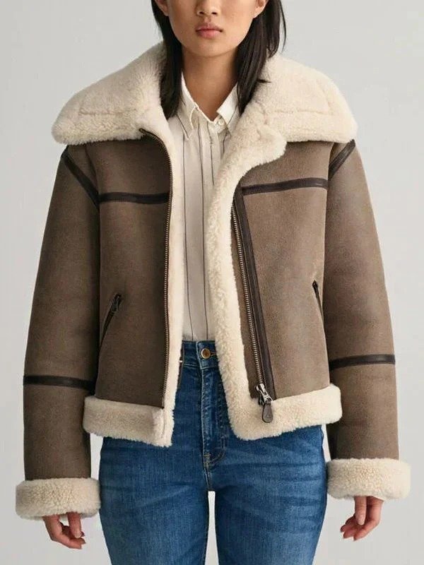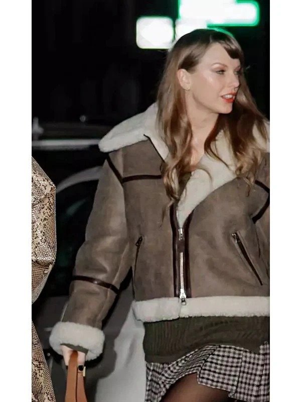 Inspired by the singer’s effortlessly elegant look, the Taylor Swift Aviator Shearling Jacket exudes timeless appeal as she transitions into winter. This garment, made of genuine leather, is all about warmth and elegance. It is both stylish and practical, with the shearling lining keeping you warm even in cold weather. The focal point is the soft shearling collar, which lends a retro aviator feel to any casual outfit. A contemporary touch is provided by the front zip fastening, which keeps out the cold and ensures a snug fit. This jacket offers unrivalled comfort and a fashionable touch thanks to the shearling cuffs. In a deep brown colour, it goes perfectly with jeans, boots or even a flowing dress. With a homage to vintage aviation aesthetics, this Taylor Swift NYC Brown Shearling Jacket is a striking fashion statement, whether you’re going out for a night drive or a coffee. Shop the Swift-inspired style now with this Taylor Swift Shearling-Trimmed Jacket, delivering cozy-chic vibes all season. Get ready to embrace winter in true Swiftie fashion with the must-have Taylor Swift Aviator Shearling Jacket.