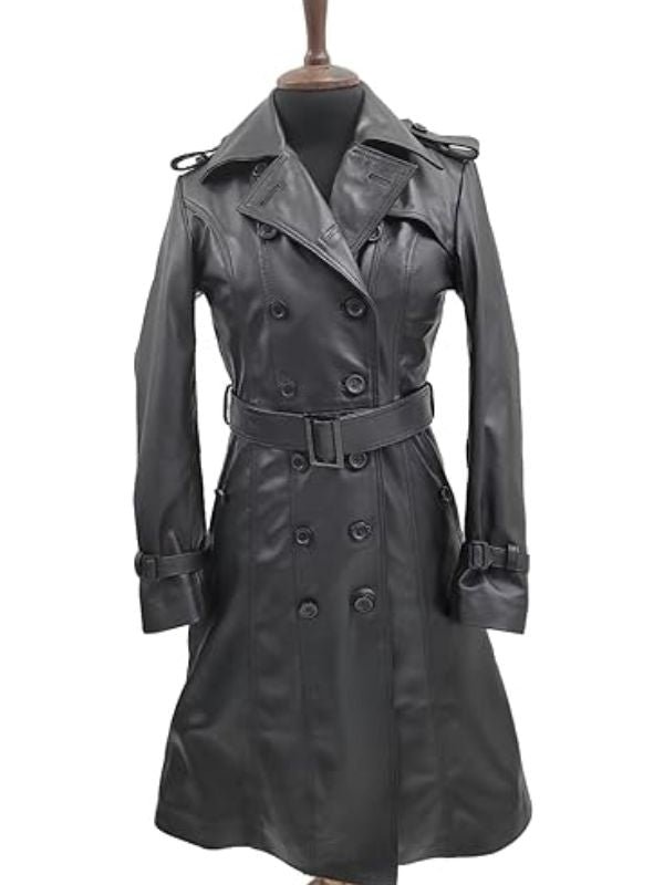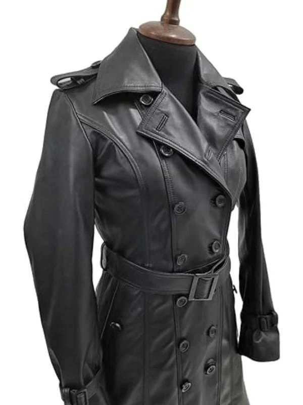 The Women Designer Black Trench Leather Long Coat is the ultimate in elegance. Expertly crafted, this coat features an opulent viscose lining that ensures comfort without compromising on fashion. The button fastening lends a touch of sophistication and the lapel collar radiates class. This Women Black Leather Designer Trench Coat is a classic addition to any wardrobe and is ideal for any occasion, be it a formal or an informal gathering. Its elegant design and superb workmanship will elevate your outfit. Masterfully combining style and utility, this splendid garment exudes sophistication and unparalleled craftsmanship. Additionally, the Womens Black Leather Belted Trench Coat further accentuates the silhouette, adding a timeless charm to the ensemble.