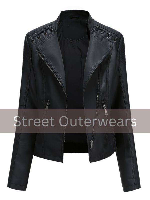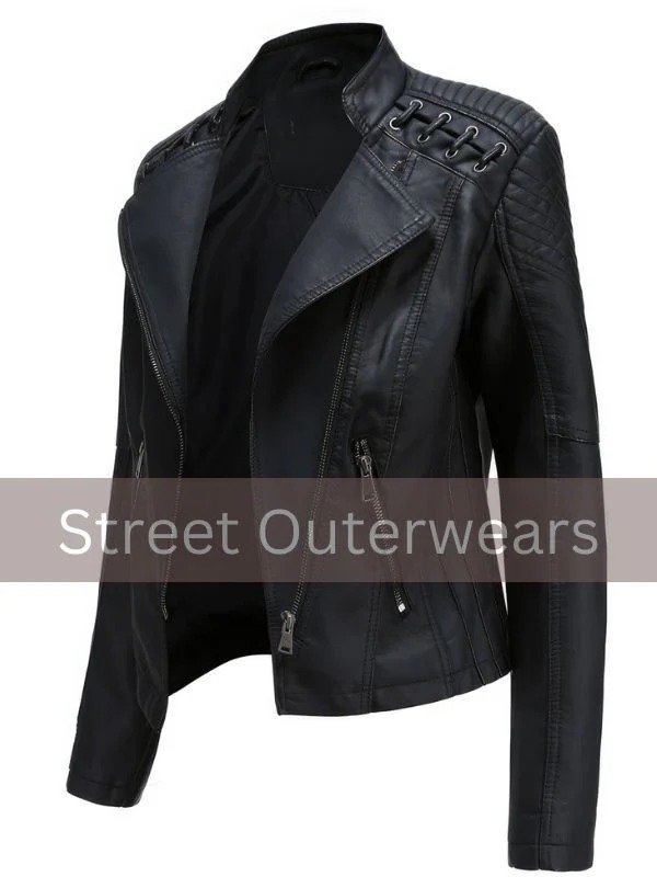 Introducing the Womens Black Biker Quilted Shoulders Laced Leather Jacket, a timeless piece that exudes classic elegance combined with sleekness. The distinctive quilted shoulders of this jacket make a statement and are made from high quality leather. The lace-up design wonderfully complements the lapel-style collar, adding a touch of sophistication. The front zip fastening combines functionality and style. Even though the open him cuffs add a contemporary touch, size women’s Real leather jacket lace up moto biker jacket with the viscose inner lining ensures comfort and durability. This jacket will attract attention and effortlessly enhance your look, Whether you’re a fan of the Womens Black Biker Quilted Shoulders Laced Leather Jacket or seeking a size women’s faux leather jacket lace up moto biker jacket, this piece is sure to captivate admirers with its stylish allure. Its meticulous craftsmanship and attention to detail set it apart as a must-have addition to any fashion-forward wardrobe.